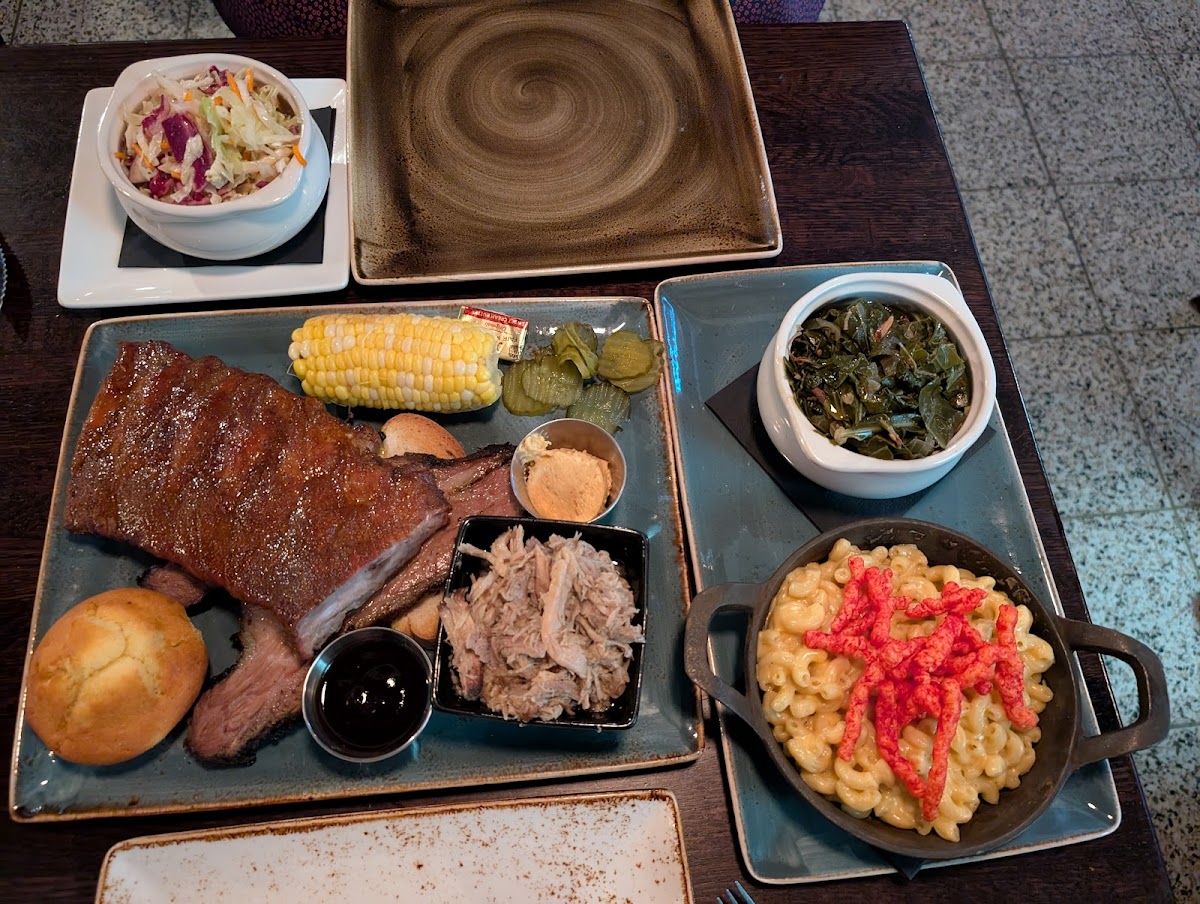 The menu showcases a rich array of flavors, emphasizing BBQ and Southern staples. Start your indulgent journey with their Braised Greens Smoked Pork Shank & Bacon Salt—a tantalizing side that perfectly balances savory and smoky notes for just $7. For a truly indulgent experience, try the Mac & Cheese topped with Flamin' Hot Cheetos at $7, or the exquisite Coleslaw that’s a refreshing twist on a classic ($7). The Cornbread Muffin, served with a side of cayenne honey butter for $4, provides the perfect sweet complement to any meal.
